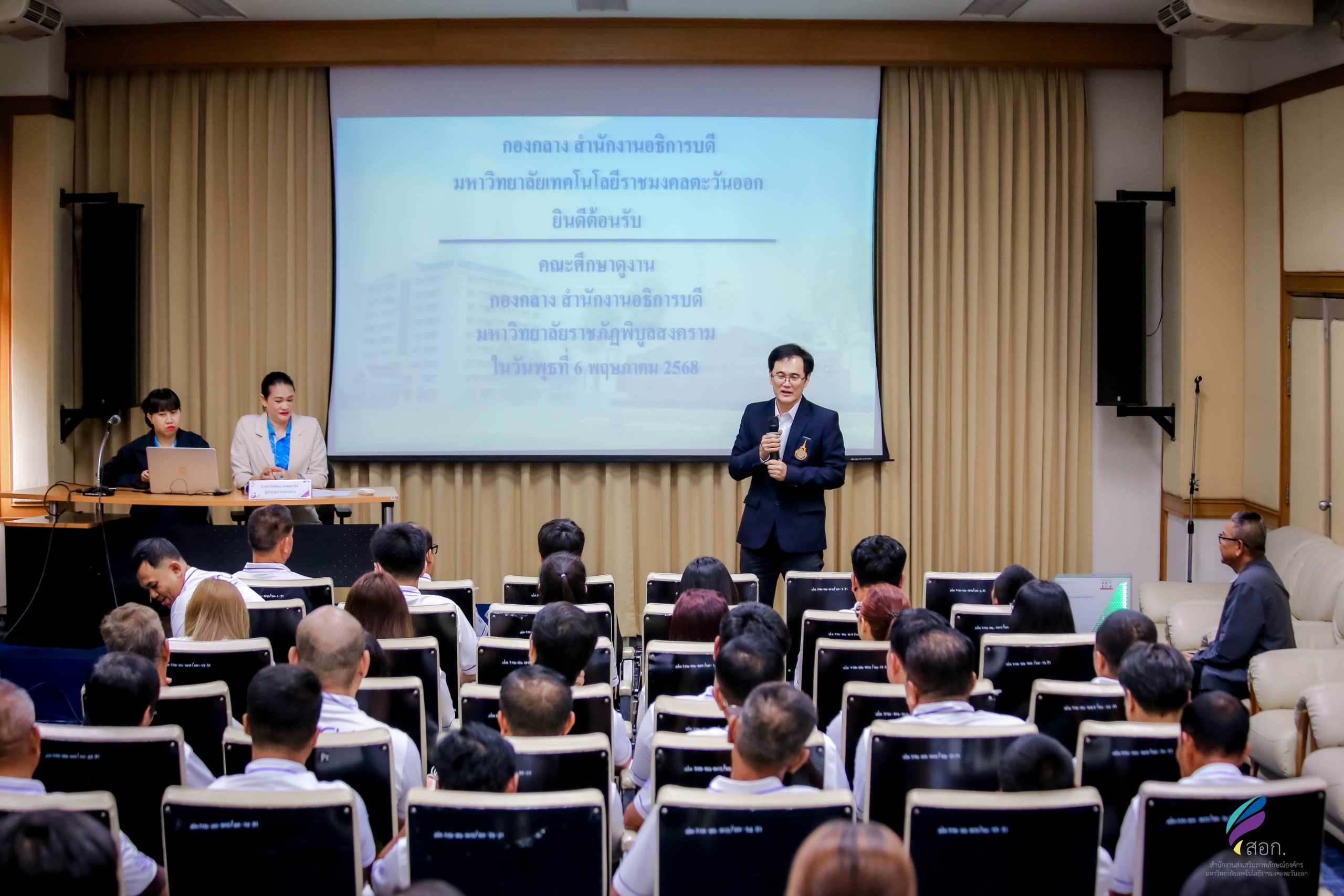รองอธิการบดี (อาจารย์กฤษฎา อนันตกาลต์) และผู้อำนวยการกองกลาง นางสาวภคมน คงสมมาตย์ และบุคลากรกองกลาง สำนักงานอธิการบดี มหาวิทยาลัยเทคโนโลยีราชมงคลตะวันออก ต้อนรับคณะศึกษาดูงาน กองกลาง มหาวิทยาลัยราชภัฎพิบูลสงคราม โดยมีผู้อำนวยการกองกลาง นายอำพน กลีบปาน และบุคลากรกองกลาง ของมหาวิทยาลัยราชภัฎพิบูลสงคราม ร่วมแลกเปลี่ยนเรียนรู้ เพื่อจัดทำแผนพัฒนาตนเองและองค์กรทั้งระบบคนและระบบงานแบบพลิกโฉมกองกลาง รุ่นที่ 2 ในวันที่ 6 พฤษภาคม 2568 เวลา 13.30 น. ณ ห้องประชุมปฐมเทวี ชั้น 8 อาคารสรรพวิชญ์บริการ มหาวิทยาลัยเทคโนโลยีราชมงคลตะวันออก จังหวัดชลบุรี และ เวลา 14.30 น. เยี่ยมชมผลิตภัณฑ์ และรับชมวิดีทัศน์ ณ สถาบันบัวราชมงคลตะวันออก